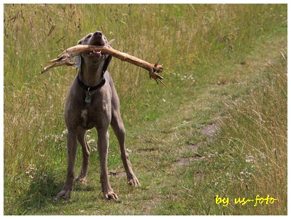 Sie hat viele Stöckchen zerbissen, dafür hat sie nichts in der Wohnung zerstört. Sie hat immer genug gehabt um darauf herum zu beißen. Wenn die zweiten Zähne raus kommen, haben die Welpen ein fast zwanghaftes Bedürfnis zu kauen. Dieses Kauen festigt die Zähne im Kiefer.